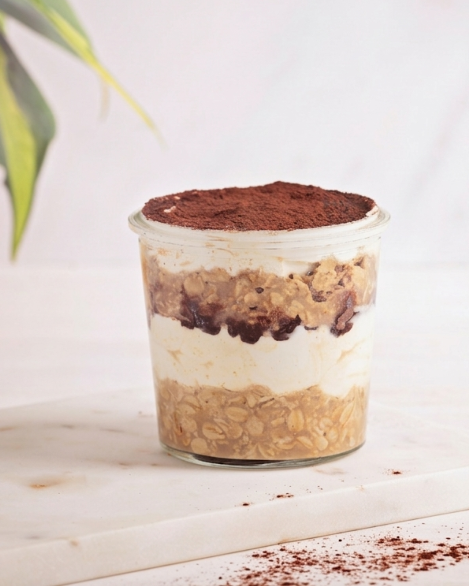 In a glass jar or bowl, layer up your breakfast starting with 3 large spoons of oats, then 3 large spoons of yoghurt.